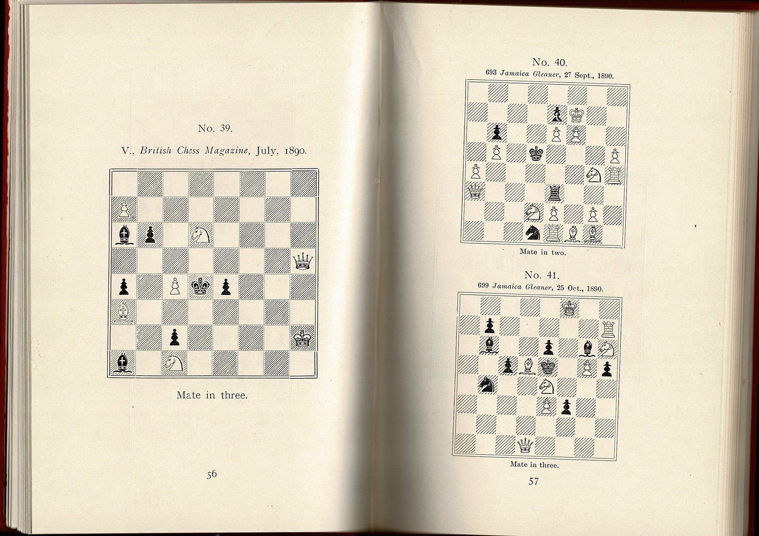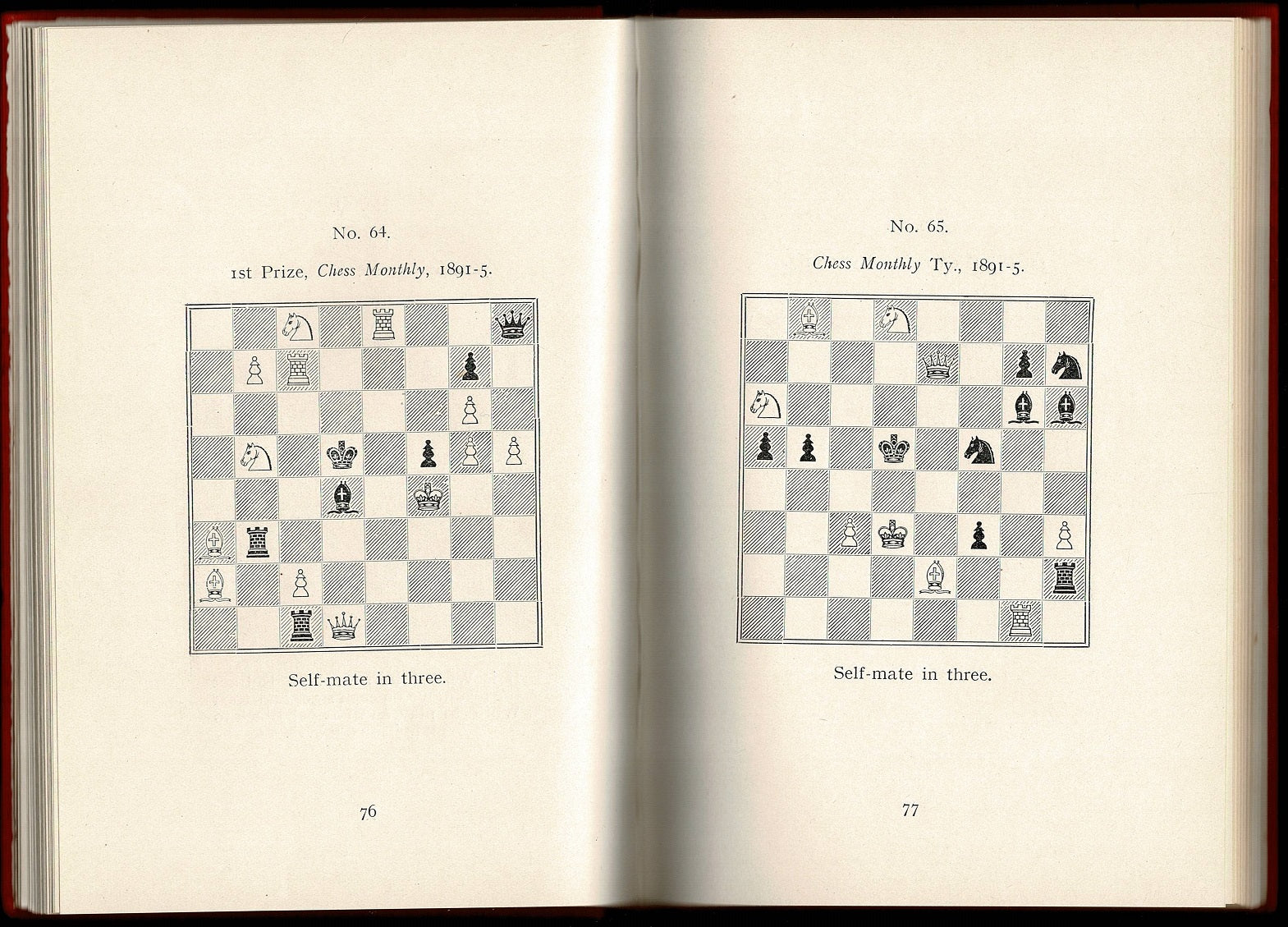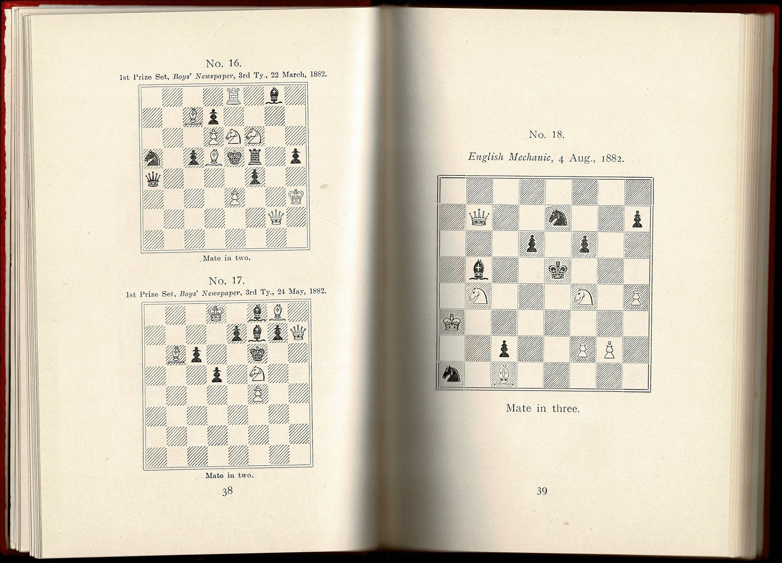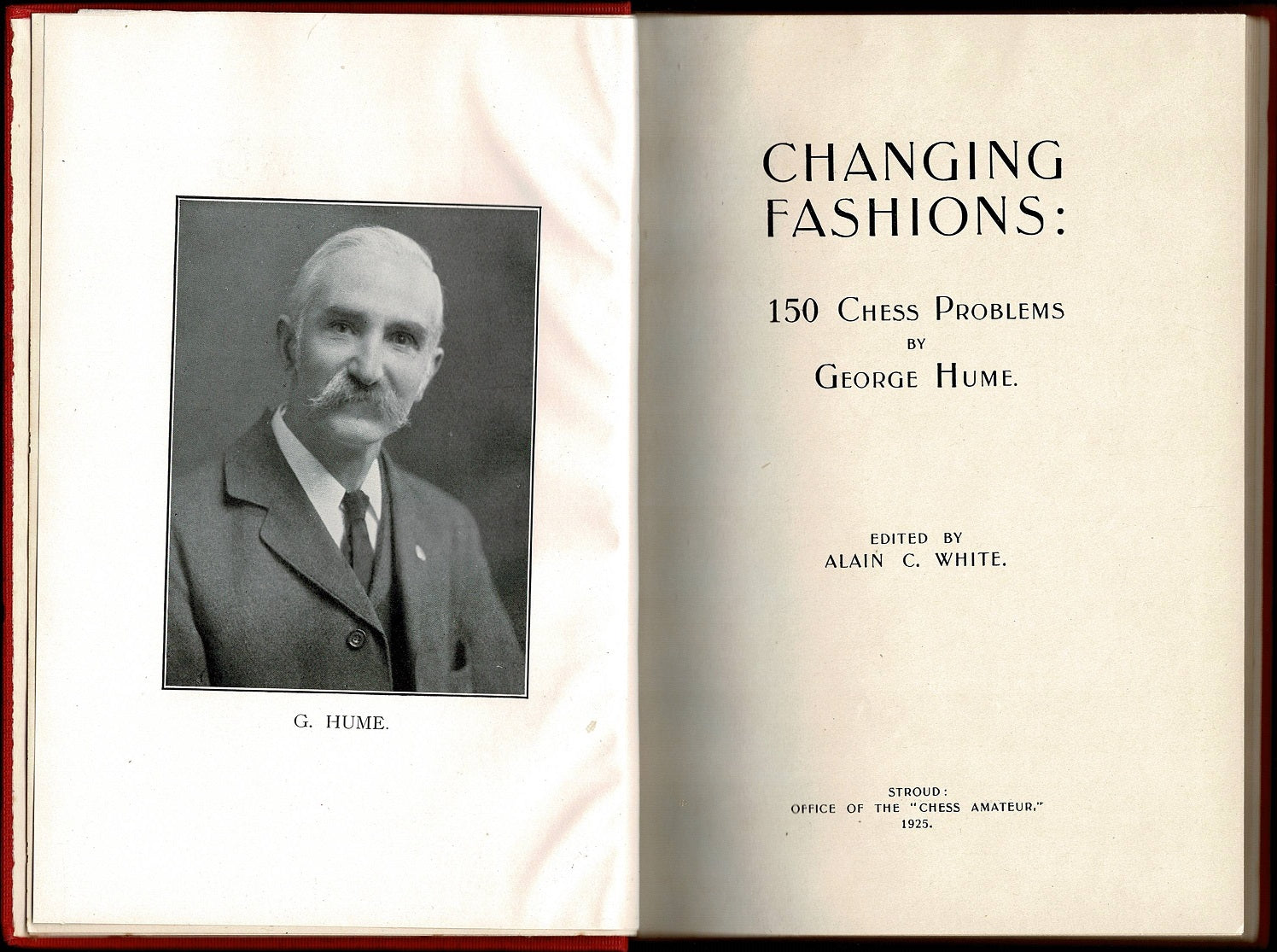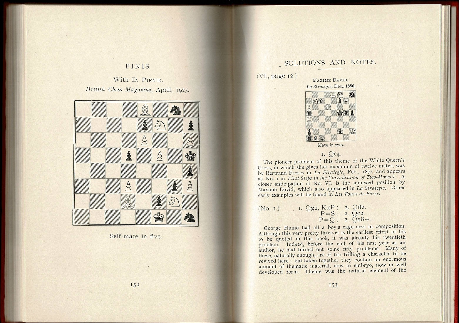 Hume provides the introduction on his problem career, including references to those appearing in the book. The 150 problems which follow consist of 37 two-movers; 35 three-movers; 74 self-mates (mostly in two); and a few others. The solutions, with annotations by A C White, appear on pages 153-199. The work is completed by a chess problem story "Uncle Jeff's problem", written by Hume in 1901.