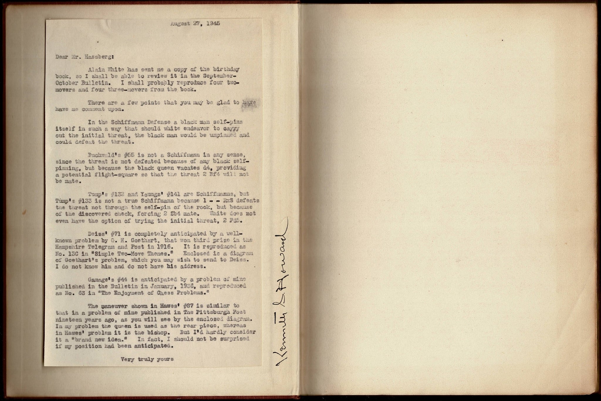 Kenneth Samuel Howard (1882-1972) one of the founders of the Marshall Chess Club and chess problem composer. He wrote several books about chess composition: The enjoyment of chess problems (1943), How to solve chess problems (1945), and One hundred years of the American two-move chess problem; a collection of 212 compositions by United States problemists (1962).
