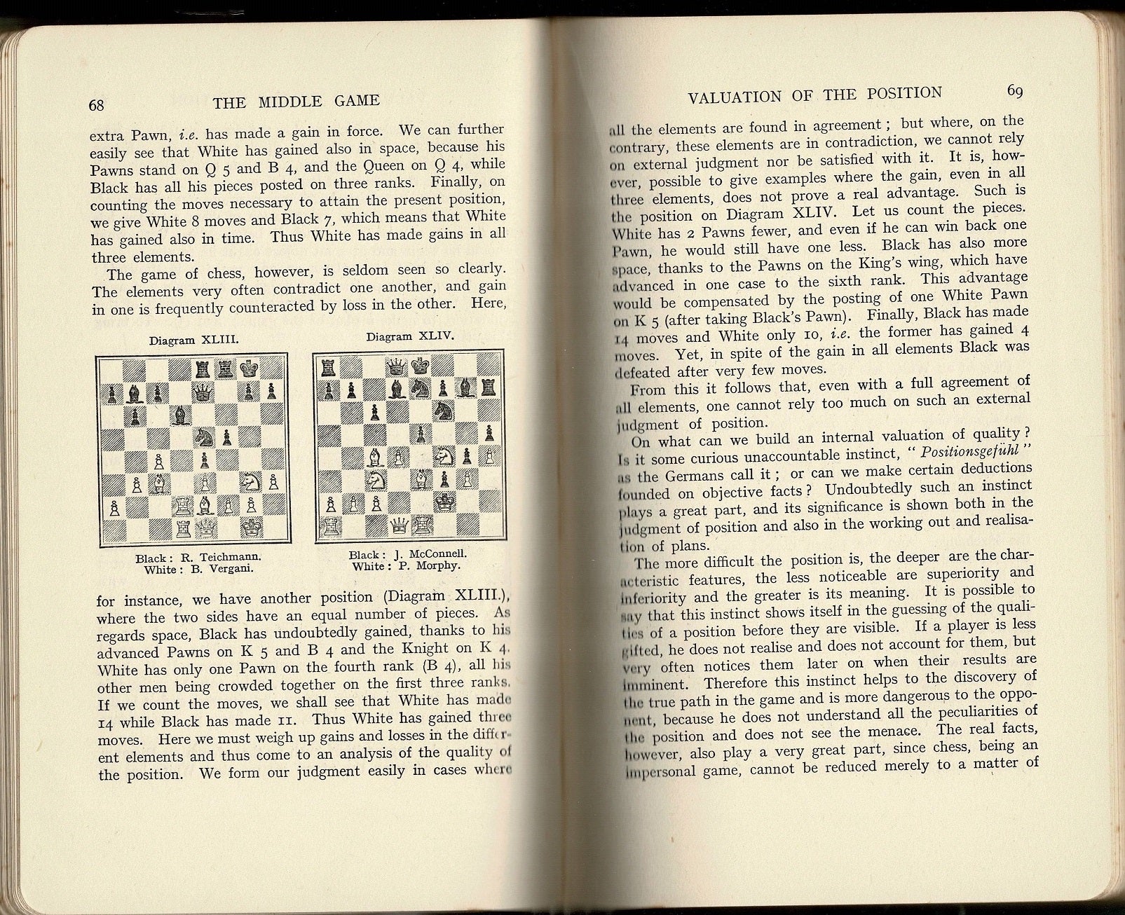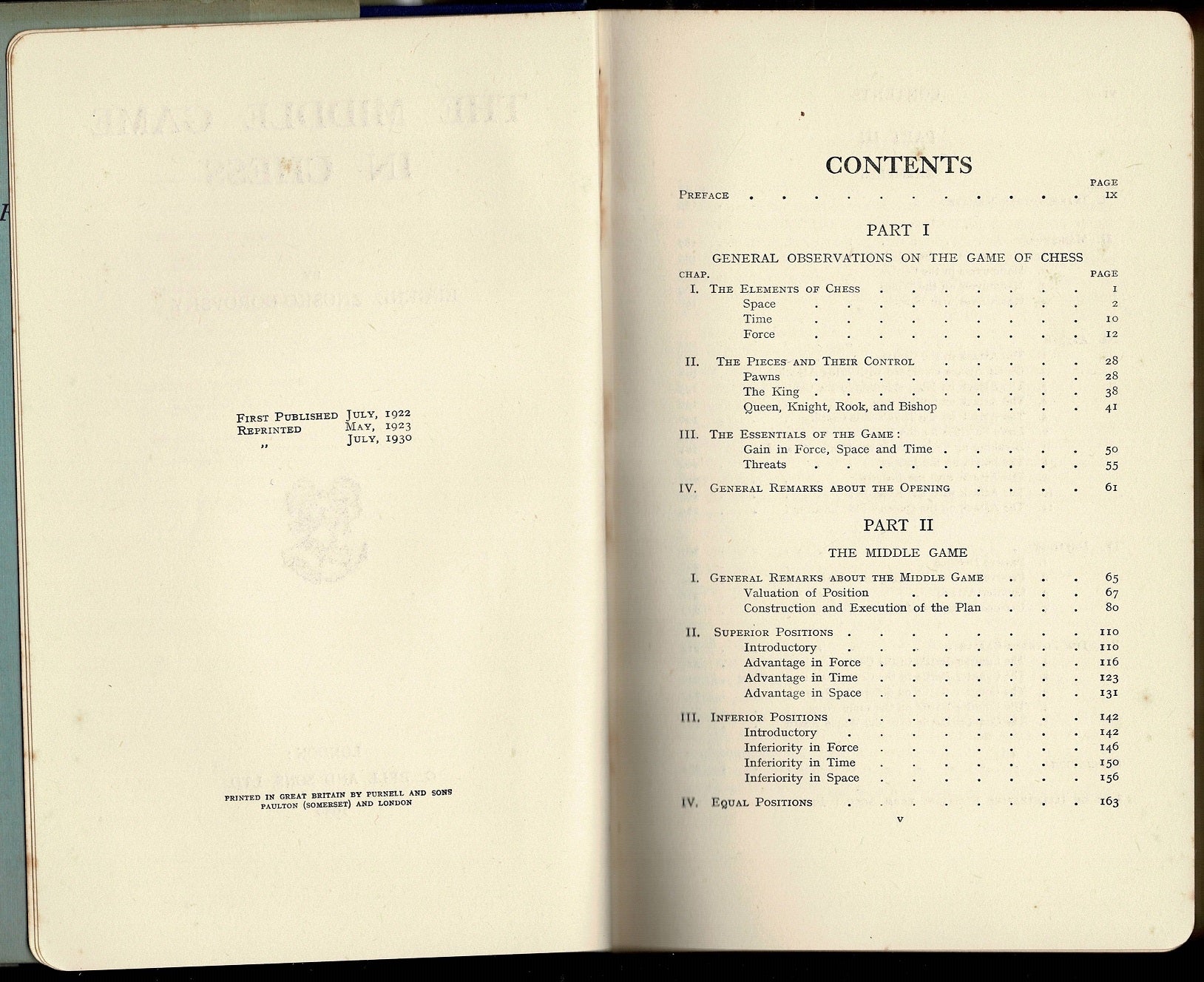 The author commences with "General observations on the game of Chess", examining the elements in terms of space, time and force. Part two is devoted to the middle-game, including evaluation of positions, construction and execution of plans, and analysis of the tree groups of positions, superior, inferior and equal. Part three contains twenty "examples, illustrating, "maneuvers, "attack", "Defense" and "the counter-battle". Includes 100 game positions in all.