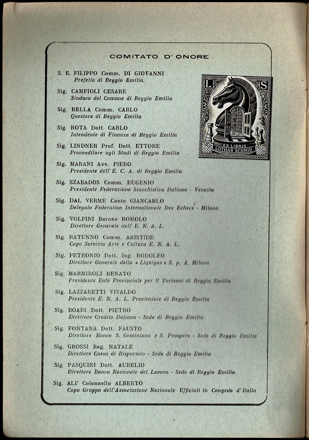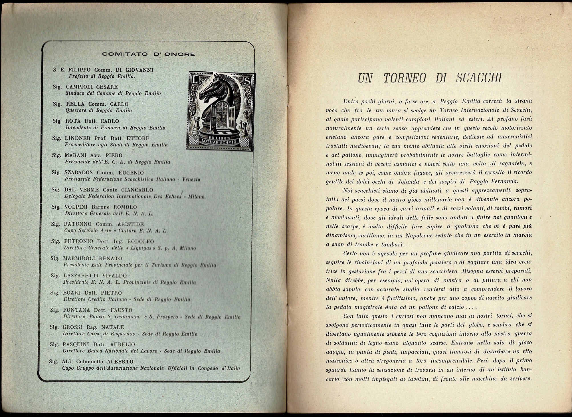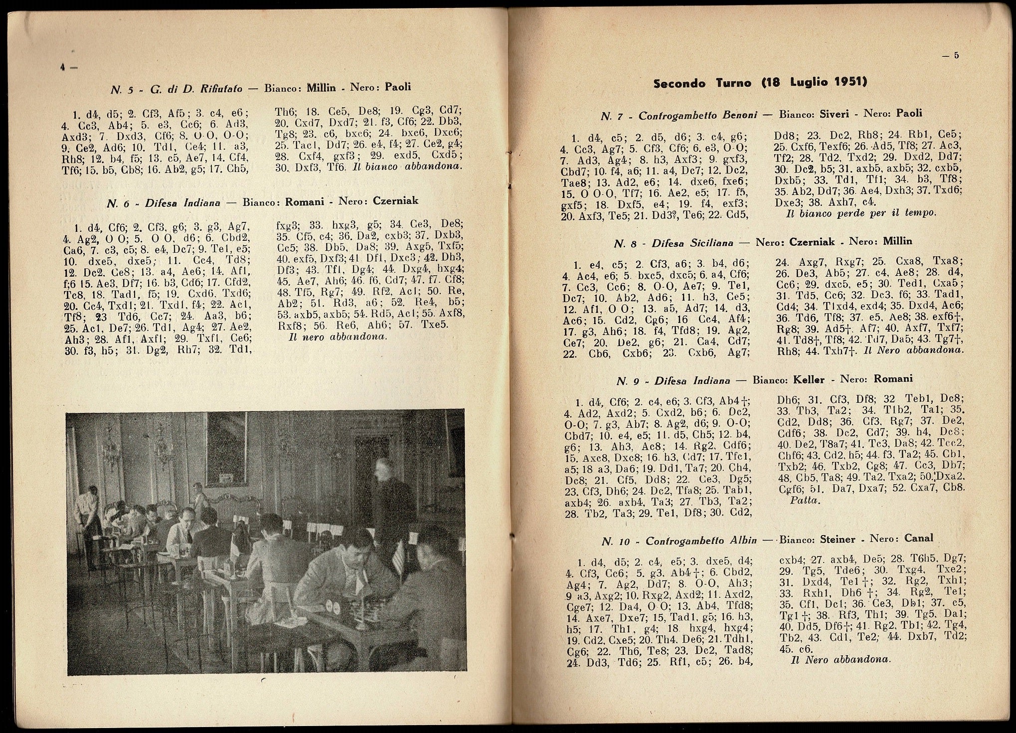 The Reggio Emilia chess tournament is a chess tournament played in Reggio Emilia, Italy. In Italian the tournament is called Torneo di Capodanno (New Year's tournament), as it starts just after Christmas and ends on the day of Epiphany (6 January). It was established as an annual event in 1958 by grandmaster Enrico Paoli. It is Italy's oldest and most renowned chess tournament. The tournament is usually played as a 10 to 16 player round-robin tournament. The 1952 was the first edition of this tournament which had twelve combatants. Moshe Czerniak was the victor with a score of 9/11 easily out distancing the second place finisher, the American Herman Steiner, by a full point. Elio Romani and Enrico Paoli, both Italians fished third and fourth each half point behind in their respective places. Fifth and sixth was shared with Hans Keller of Austria and Federico Norcia of Italy each with 5 1/2 points.