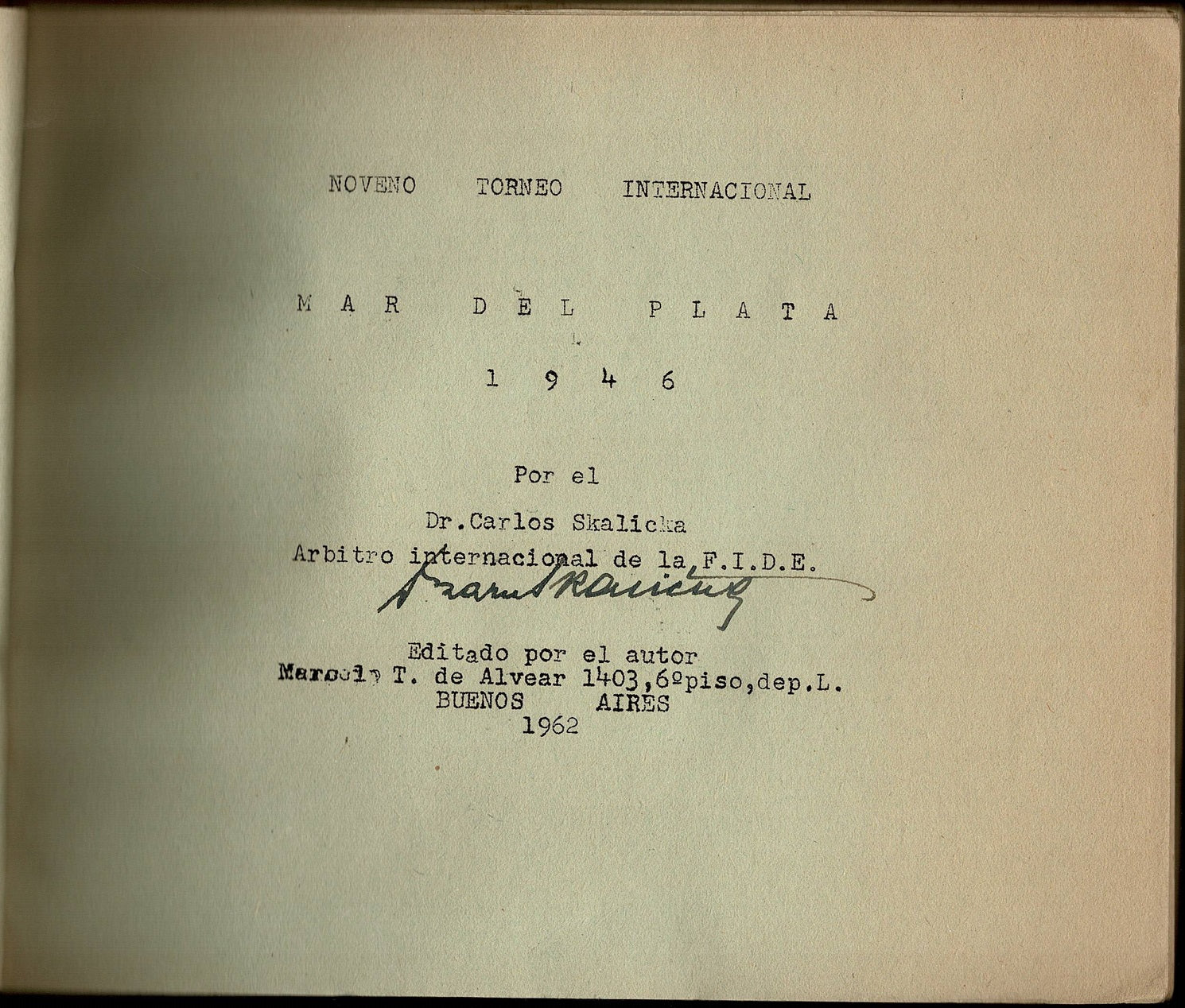 Autograph signature of the Czech-Argentine chess master Karel Skalicka (1896-1979) on the title page. Lothar Schmid's book plate to front wrapper verso. Edge wear with bumped corners, lightly soiled else very good.