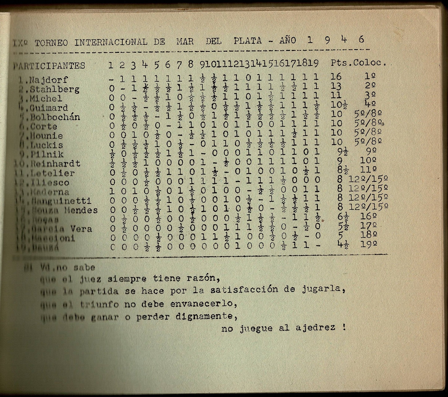 Miguel Najdorf was the clear leader with 16/18 followed by Gideon Stahlberg three points behind. In third was Paul Michel at 11. Following by a half point was Carlos Guimard in fourth. Tied for fifth through eight were Cesar Juan Corte, Carlos Hounie Fleurquin, Jacobo Bolbochan and Marcos Luckis each with 10 points.