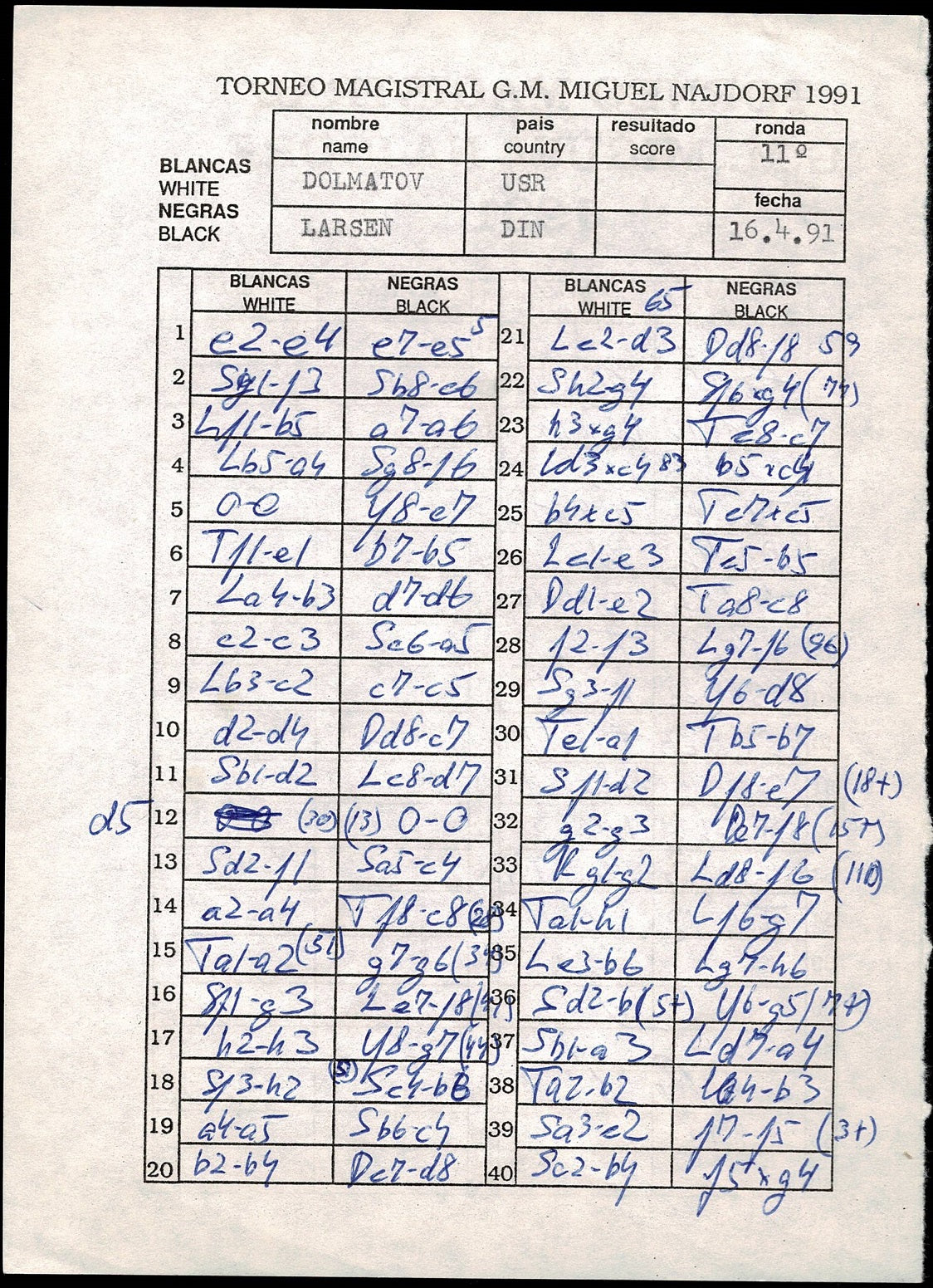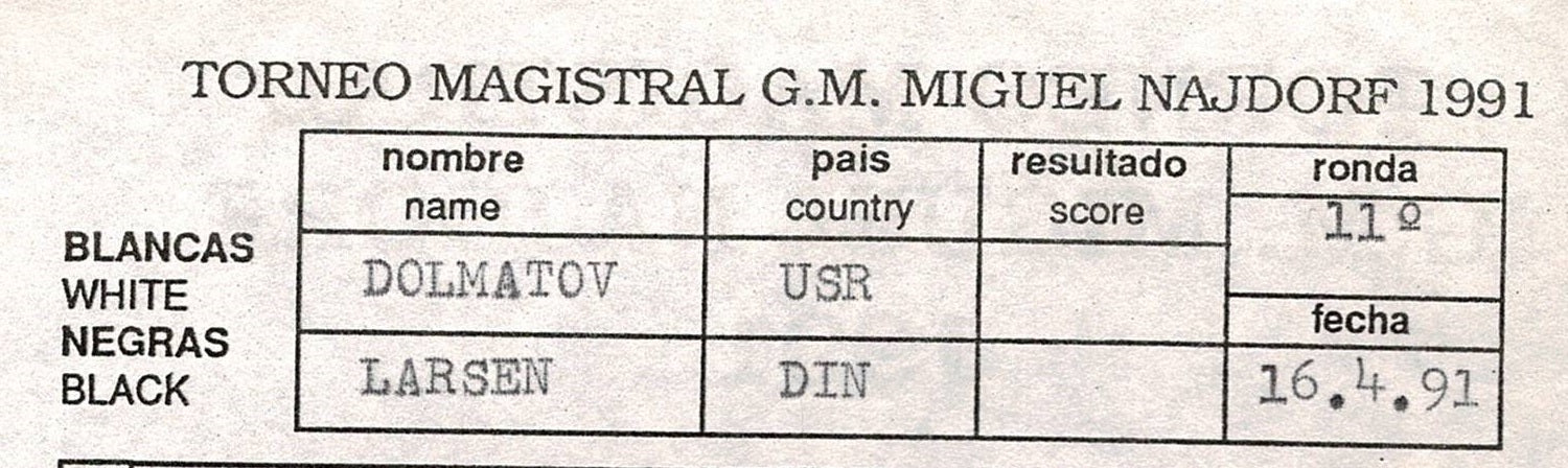 Score sheet (8 1/2" z 6") from round eleven played on April 16, 1991 in Bent Larson's hand. 54 moves of the Spanish Game: Closed Variations with Sergey Dolmatov playing white and was the winner and signed on the verso by both players.