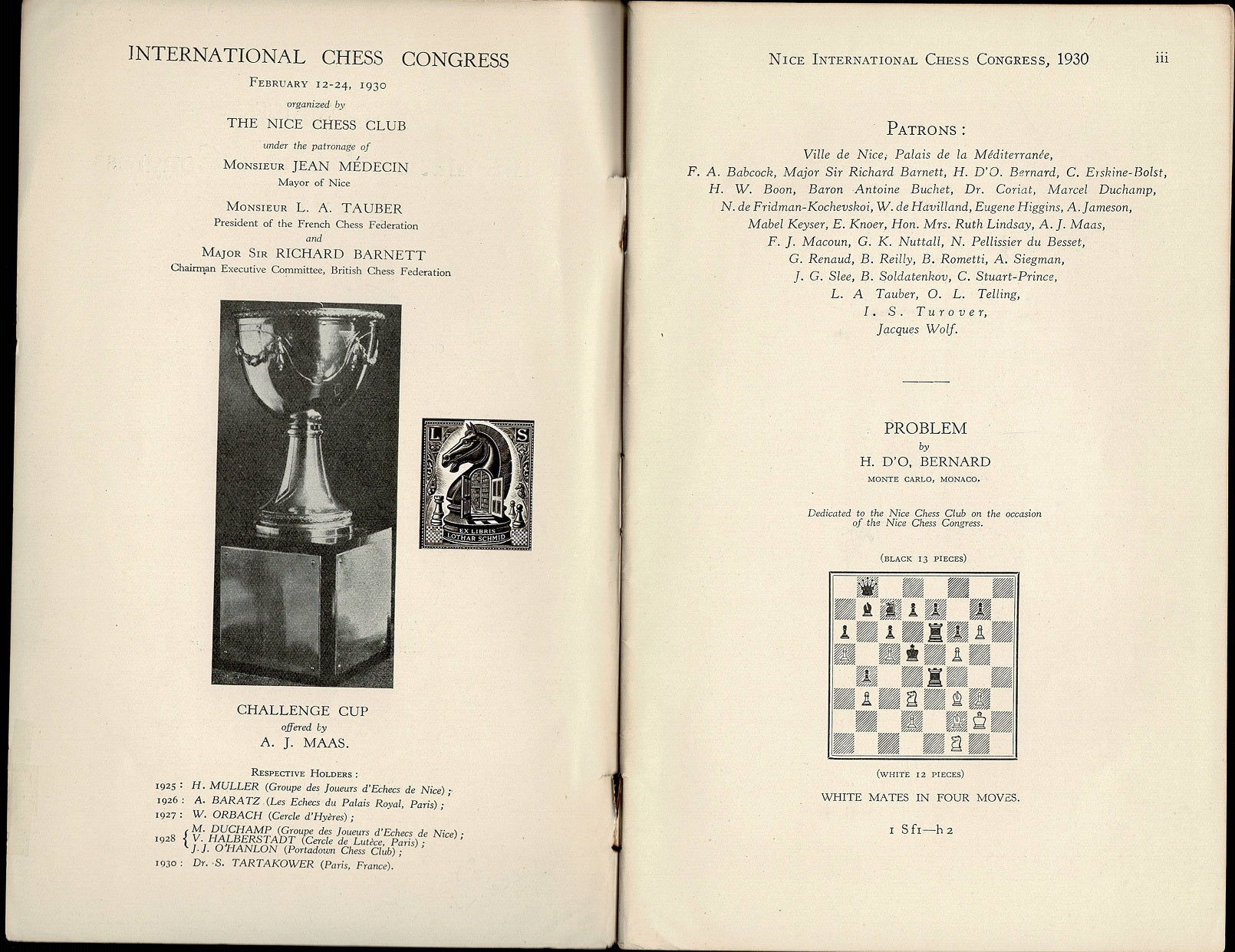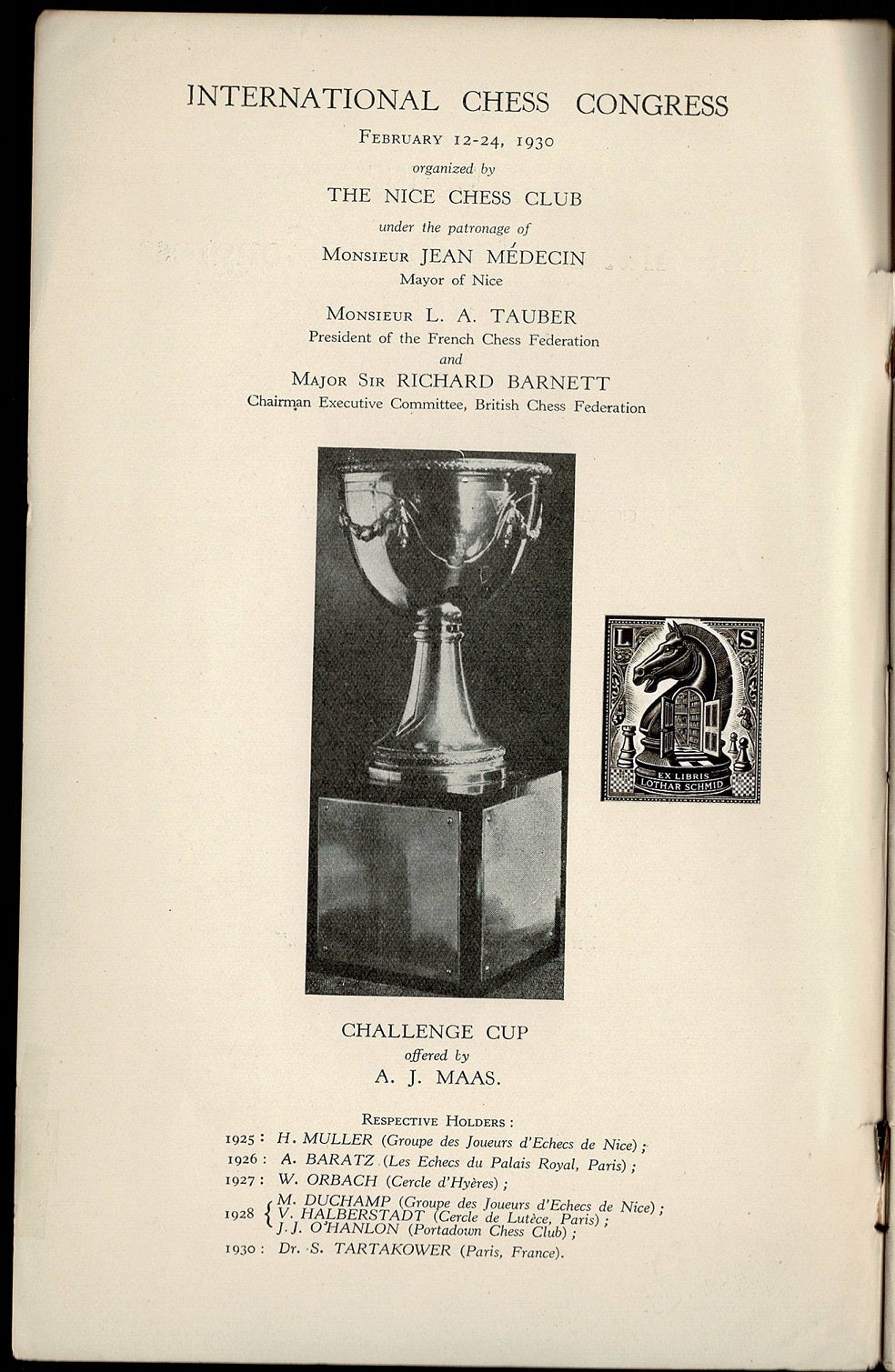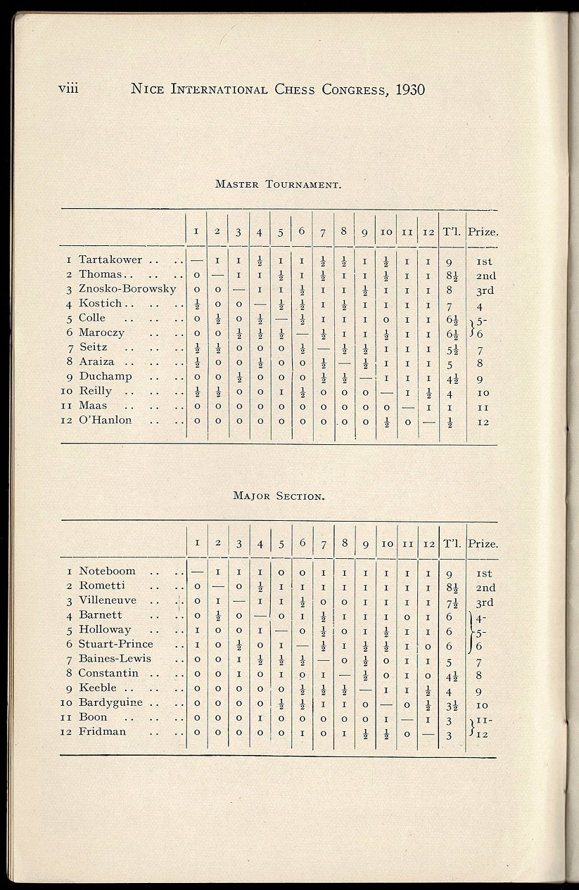 Annotations by Tartakower, Maroczy, Kmoch, Znosko-Borowsky and Cole. Savielly Tartakower captured first with 9 of 11 not losing a game. George Alan Thomas was second a half point behind followed by Eugene Znosko Borovsky with eight points. Fourth Boris Kostic with seven points. Marcel Duchamp participated in this tournament and had a score of 4 1/2.