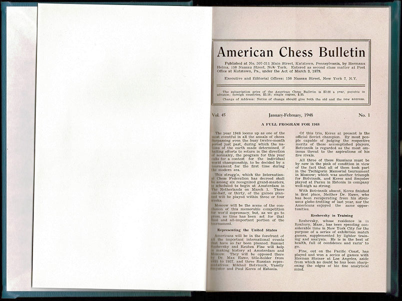 Published monthly (November-April); bi-monthly (May-October). Official publications of the United States Chess Federation. Absorbed the North American Chess Reporter after 1933. Volume 1, 1904, thru volume 60, 1963 issued. No more published after February 1963.