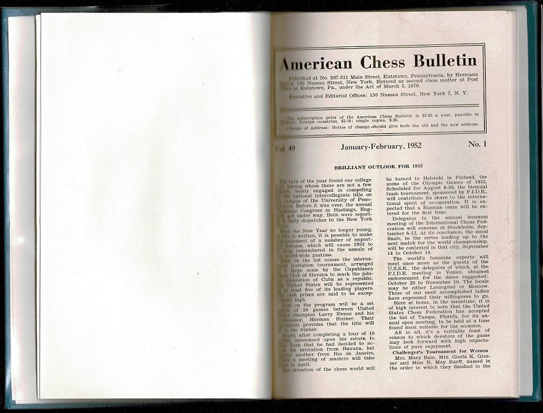 Published monthly (November-April); bi-monthly (May-October). Official publications of the United States Chess Federation. Absorbed the North American Chess Reporter after 1933. Volume 1, 1904, thru volume 60, 1963 issued. No more published after February 1963.