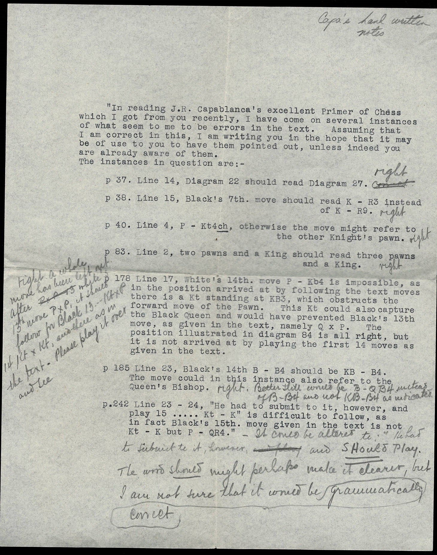Typed manuscript sent by an unknown author to Capablanca regarding errors in the first edition of A Primer of Chess with corrections in Capablanca's hand.