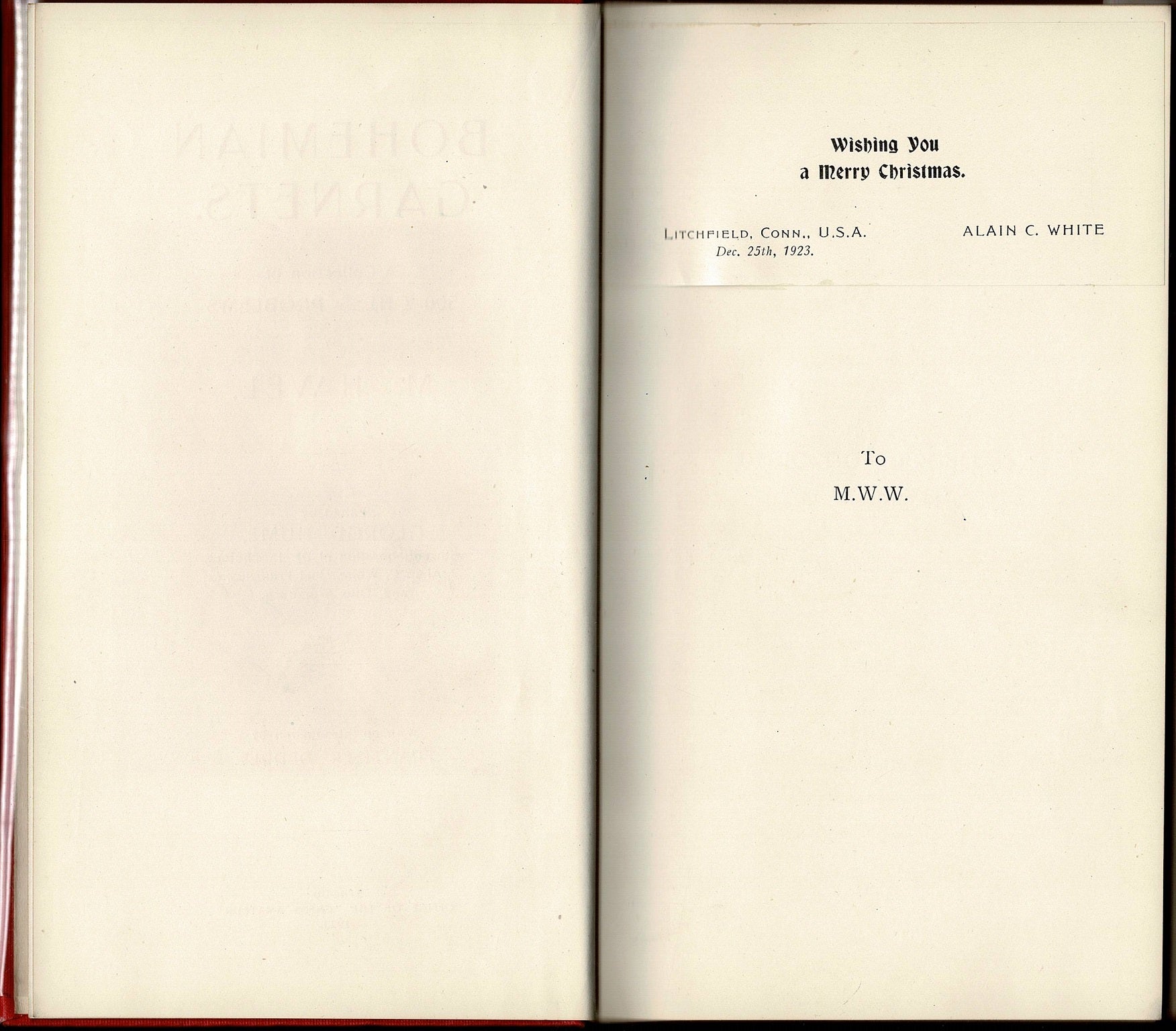 222 pages with frontispiece and diagrams. Octavo (8 1/2" x 5 1/2") bound in original publisher's red cloth with gilt lettering to spine and cover. Edited by George Hume with collaboration of Dr J Schumer, Alain C White, Joel Frilizius and Otto Wurzburg, introduction by Frantisek Dedrel. Christmas series number 23 with greetings tipped=in. (Betts: 33-37) First edition.