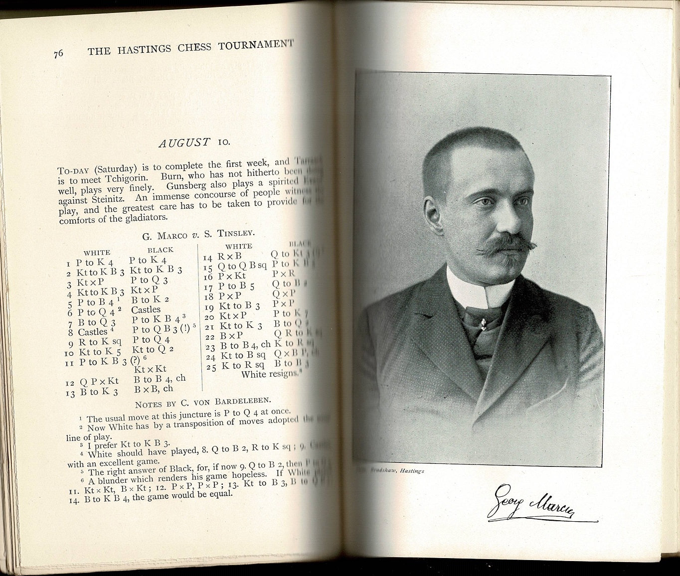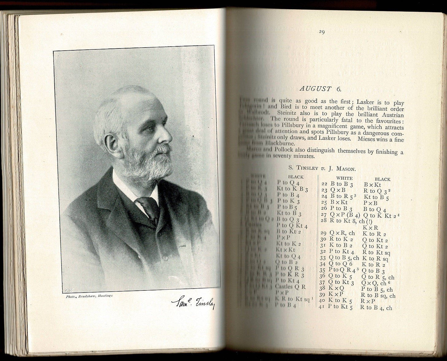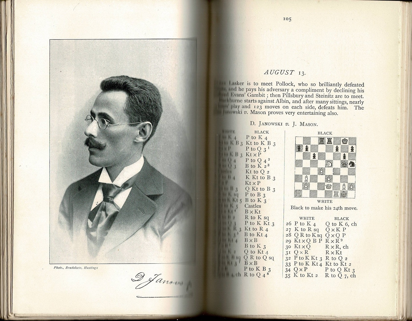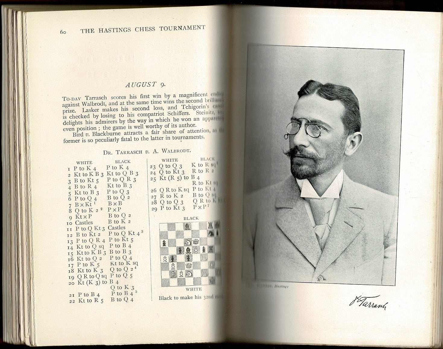Pillsbury make a total of 16 1/2 (+15 -3 =3) out of a possible 21 points and taking home the first prize of 150 pounds, followed by Chigorin (+14 =3 =4) with second prize of 115 pounds. Lasker (+14 -4 =3) beat Pillsbury in their individual game but ended third. Tarrasch, one of the pre-tournament favorites placed fourth. (Goldman: Carl Schlechter!)